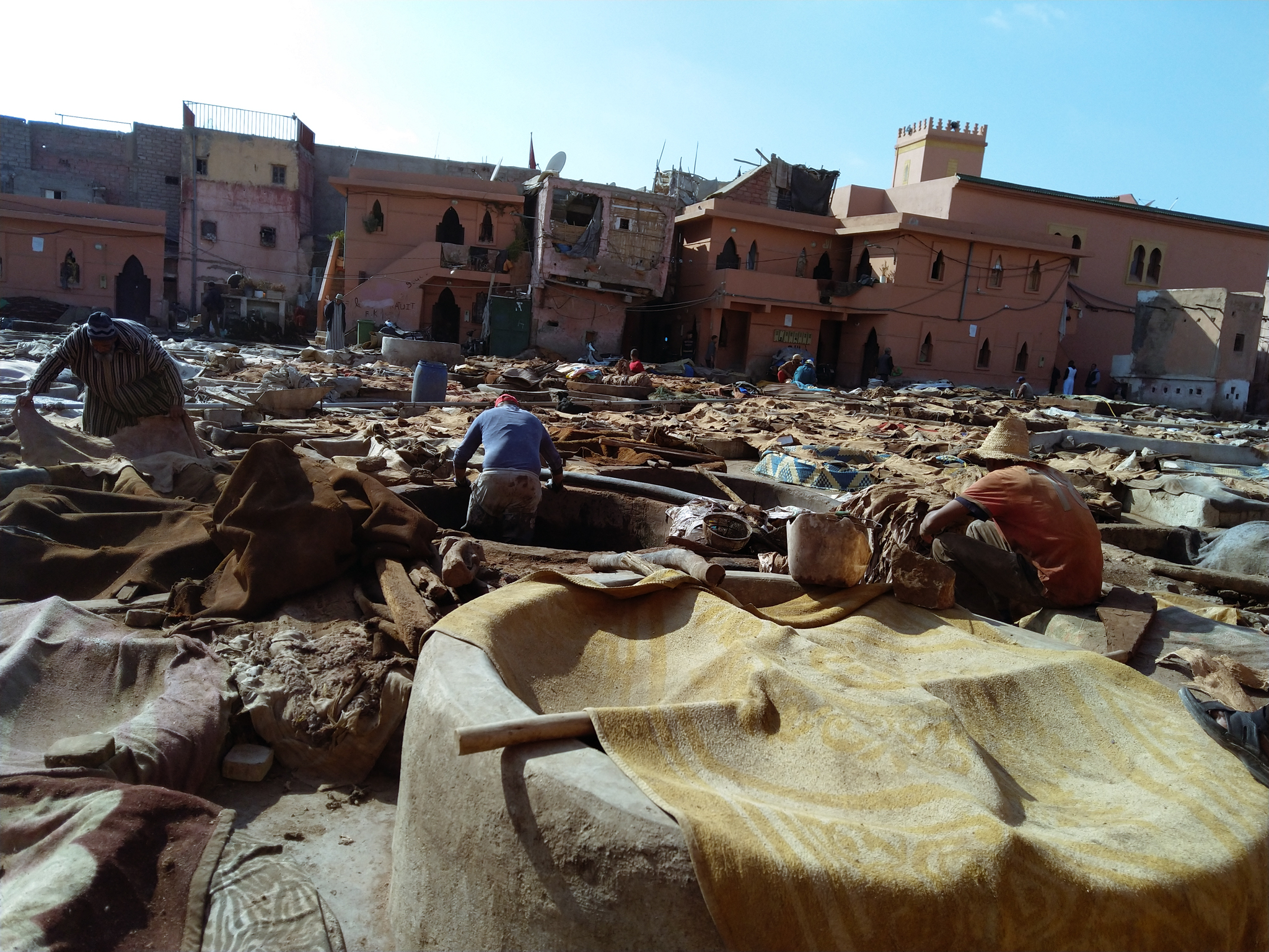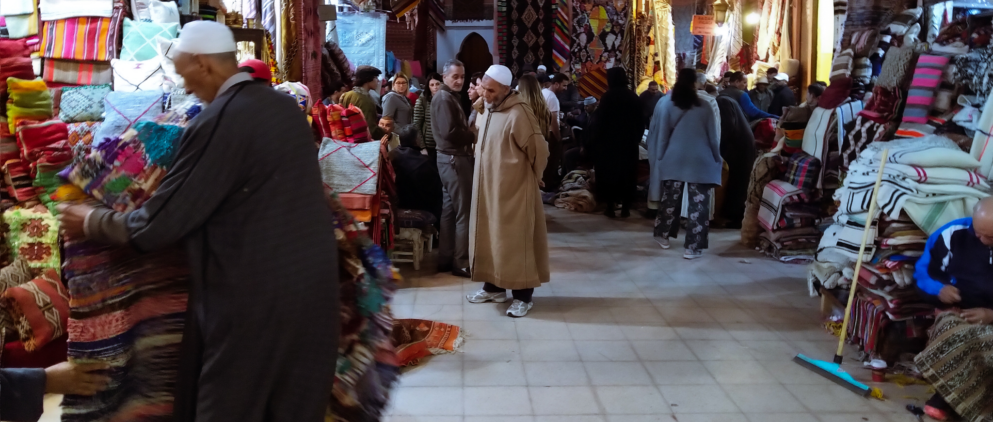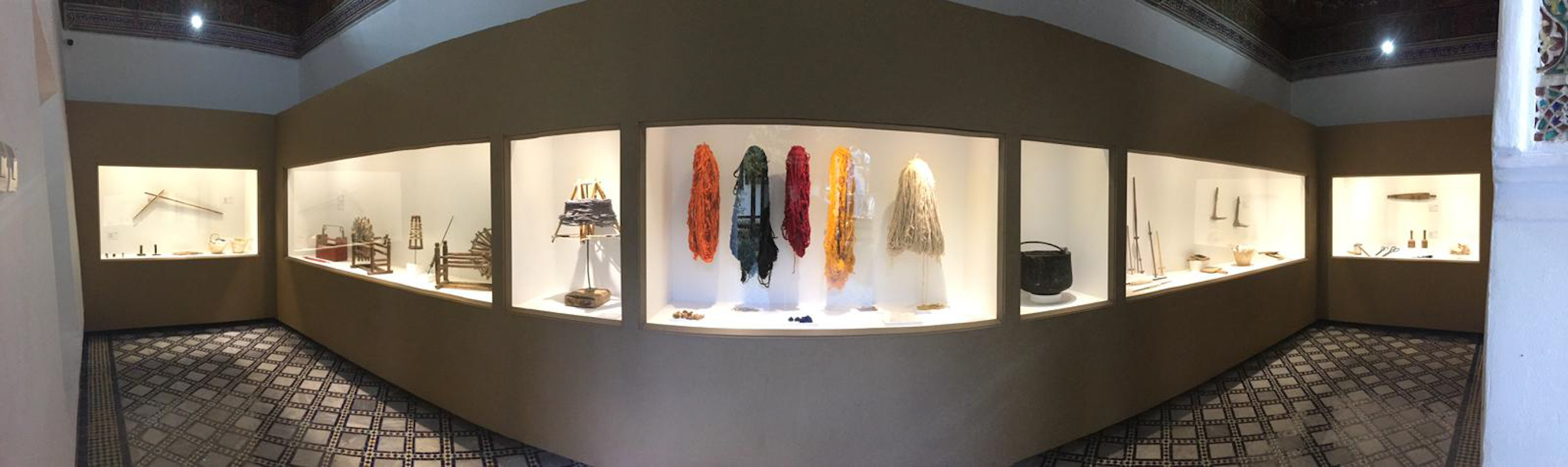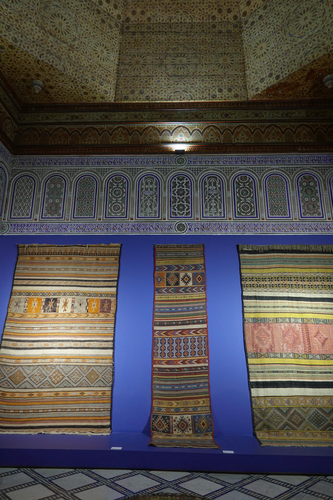 The first day of December – meteorologically speaking, the beginning of winter – is indeed a bit chillier than the two preceding days, which had been sunny and warm. Some locals assume we’ll want to visit the leather tanneries, since today is the day of the week that the Berber people come from the mountains to work on the cow hides, rather than the city Arabs who work on goat hides on the other days of the week. Once there, we get a guide, who seems a bit in a hurry, although we do get a close up view and an explanation of the tanneries. At the end, the guide of course drops us off at a leather goods shop, where the shopkeeper ofcourse demands unrealistic prices for his goods. After already having bought some spices at inflated prices, we aren’t game, so the guide will have to be paid by us rather than receive a commission from the shopkeeper. After a walk through a residential part of the medina – during which we rescue a hopelessly lost elderly Belgian couple – we visit the Moroccan Carpet and Textile museum in the Dar Si Saïd palace. It belonged to the brother of the Grand Vizier (basically a prime minister to the Sultan) who built La Bahia. Dar Si Saïd is smaller than La Bahia, but at least as beautiful, and much, much calmer. The museum does a great job of showing the process of carpet and textile making, and the different styles of carpets.
