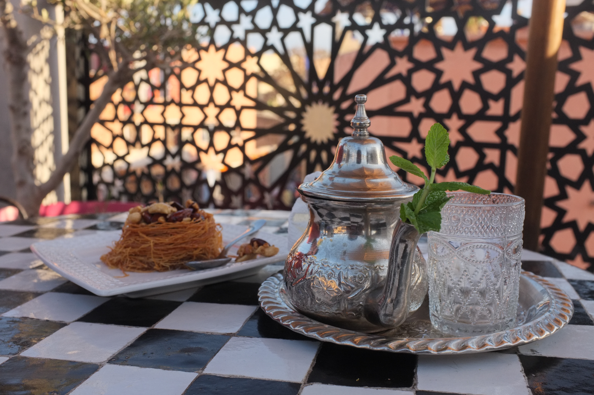 Our next planned destination, the Medersa (Quranic school) Ben Youssef is also closed, for renovations. Nevertheless we have a lovely afternoon stroll around various parts of the medina, enjoy a tea with pastry, and circle back to the madness of Jemaa el Fna. After a delicious chicken/almond tajine (Moroccan stew) and a fruity sangria on the hotel rooftop, the after dinner dip extends into a long night’s sleep after all the walking we’ve done.