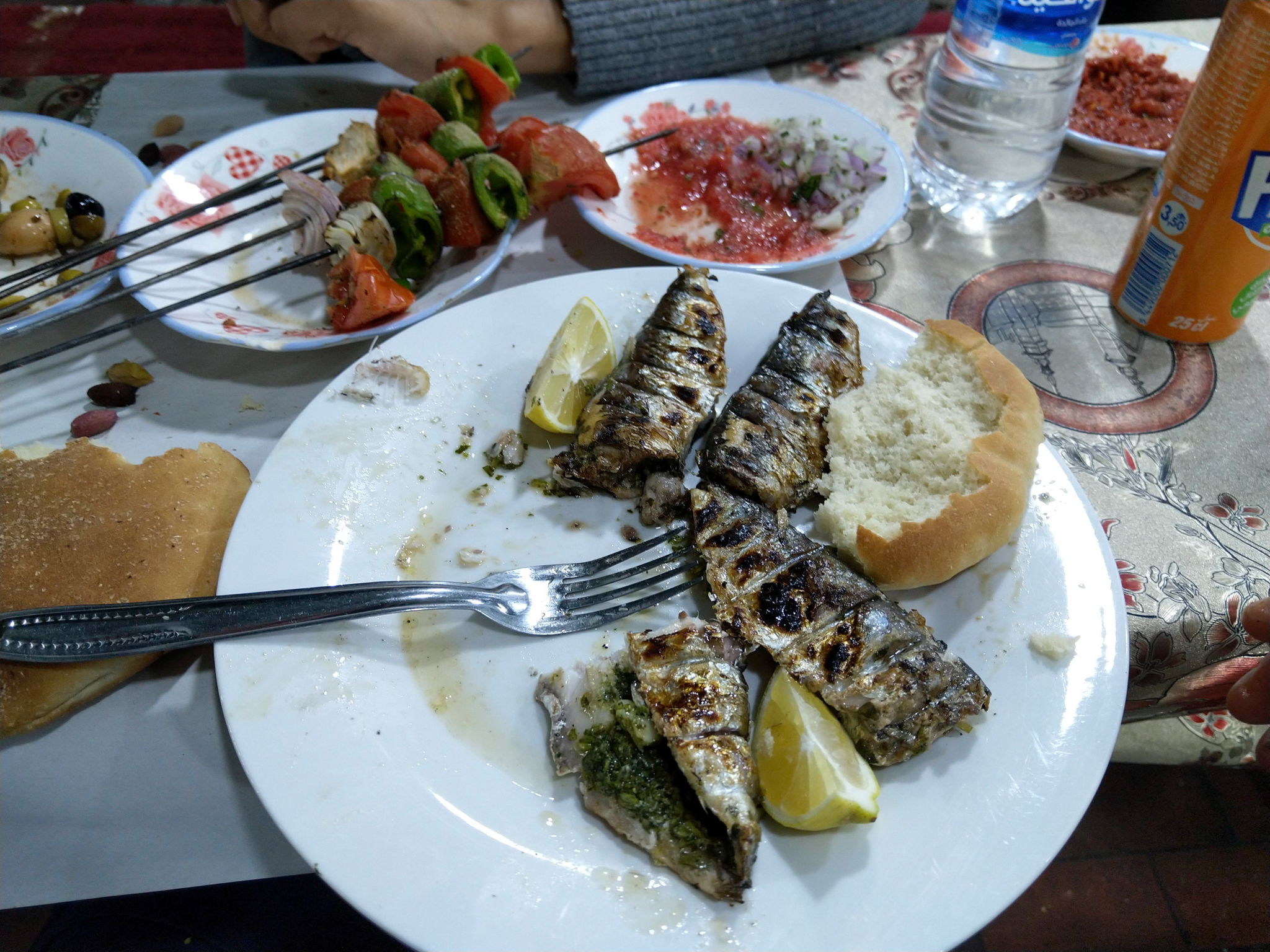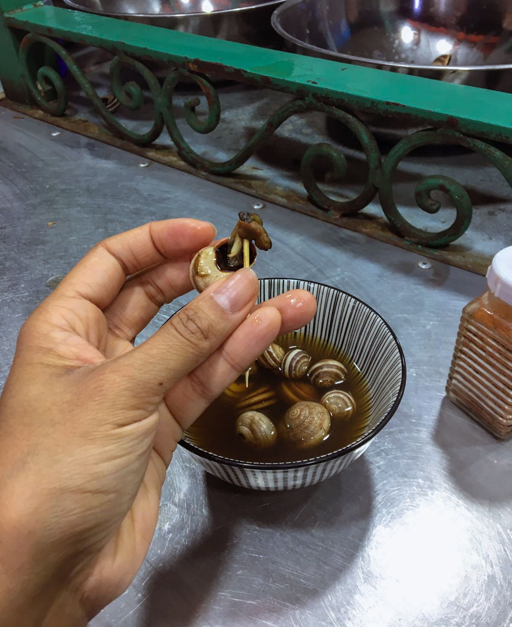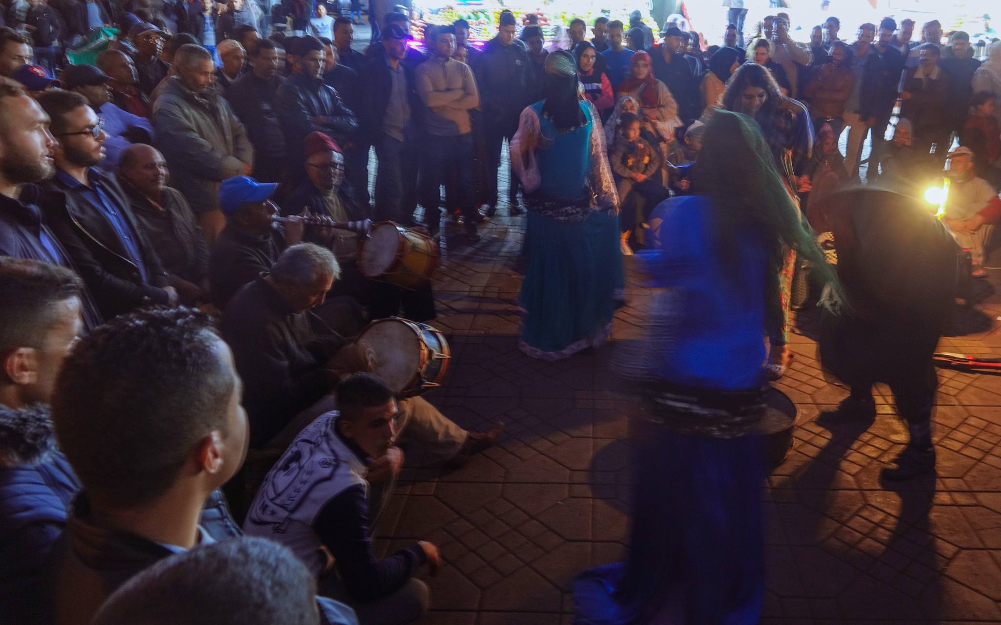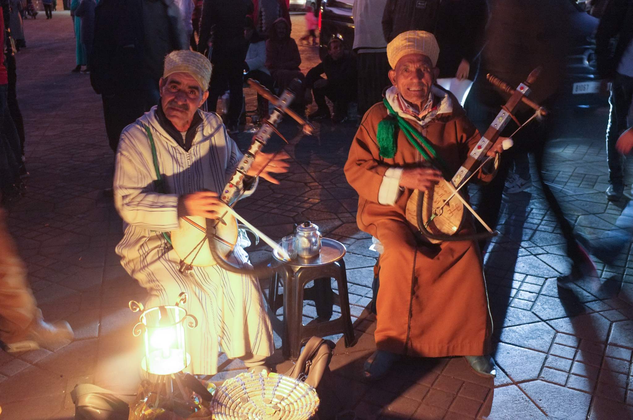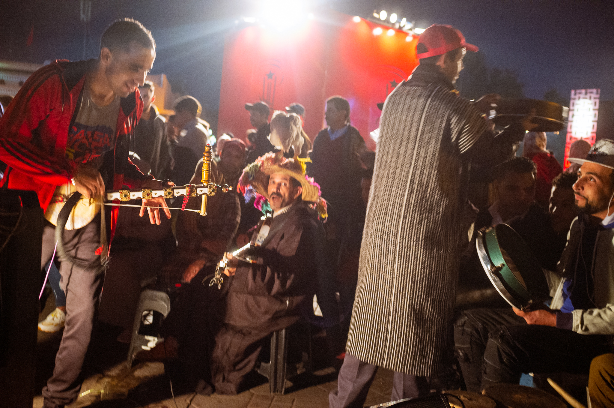 In the evening, there is more theater as the film festival draws a slightly smaller crowd. We enjoy the weirdness of old musicians, musicians with a rooster on their head, a group of Moroccan style drag queens dancing to flute music similar to what the snake charmers play, fairground games, and more. We also sip some spicy tea, eat more herb-filled sardines and snails, and have some fun trying to outsmart the salesmen. We finally make our way to one of the music instrument shops, were we meet an enthusiastic young instrument maker who takes genuine pride in showing us all kinds of instruments; we come away with a type of hand drum called Def, which has a dry sound when played one way and a nice bassy reverb sound when played another.