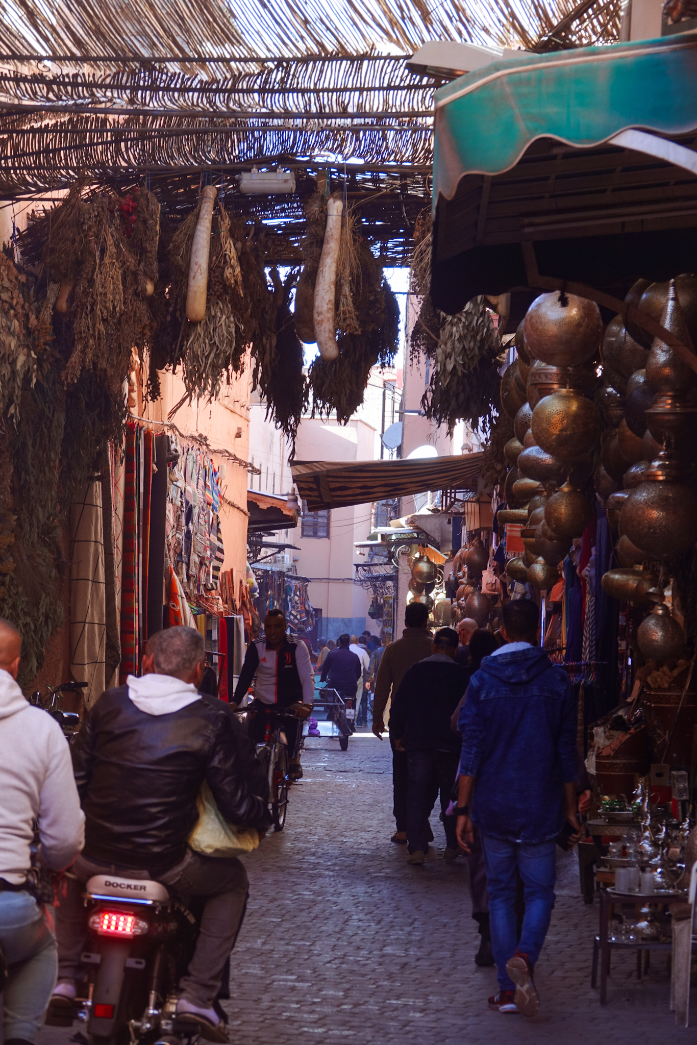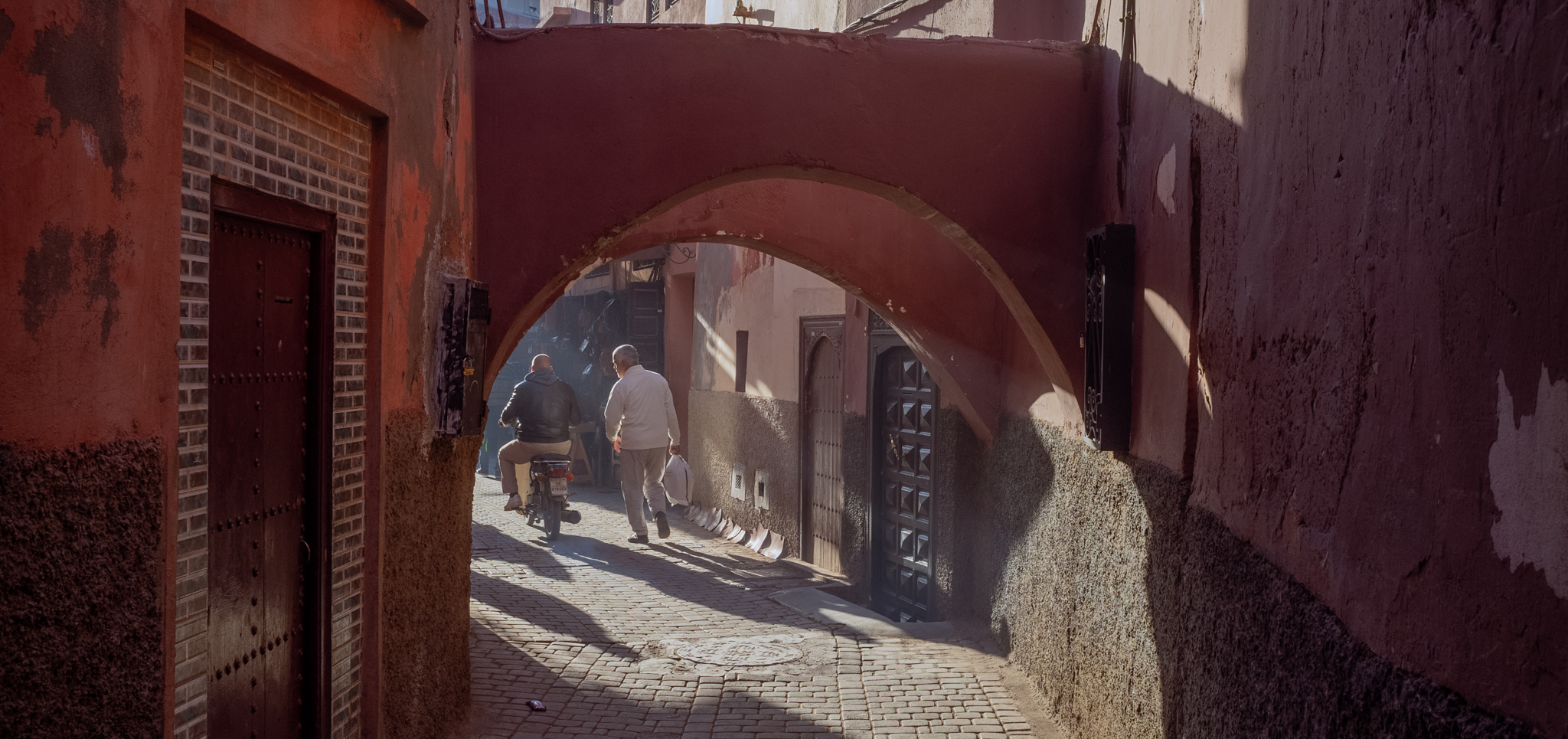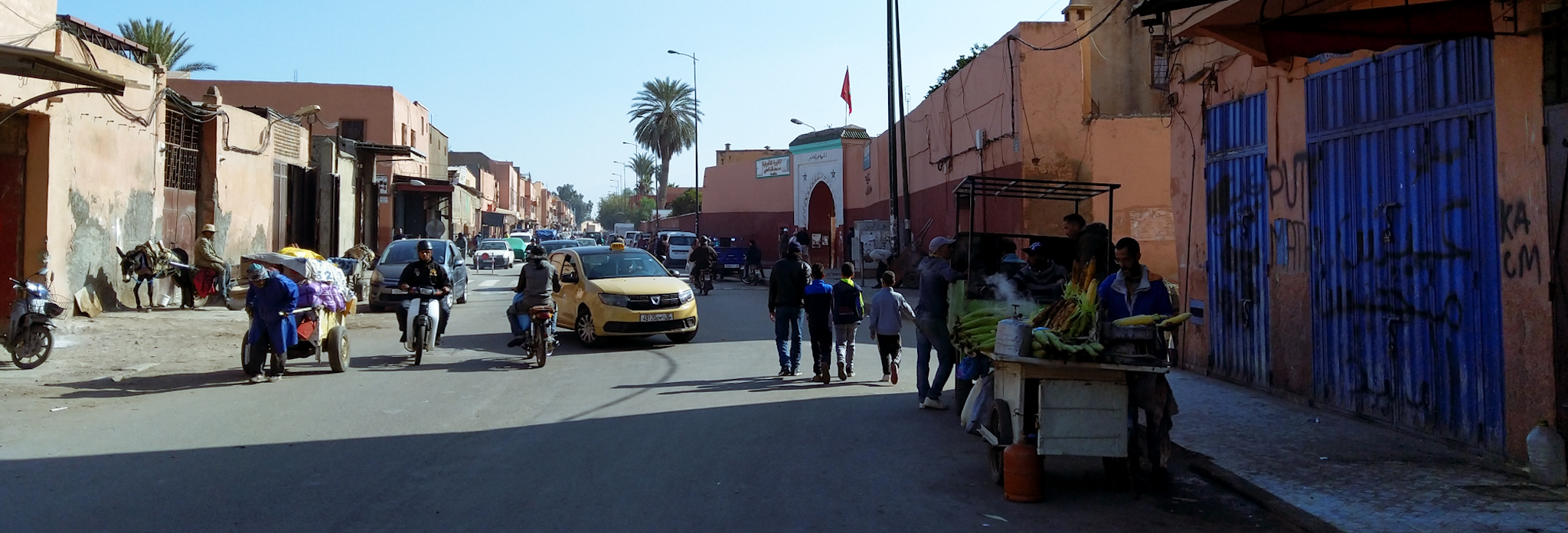 Right next to Moroccan palaces one will usually find the Mellah, or Jewish neighbourhood, since Morocco’s Jewish population traditionally supported the king or sultan in exchange for his protection. Now that the Jewish population has almost completely left the country after the foundation of Israël, the Mellah’s tiny houses and narrow alleys mean it attracts only poor residents. Its only remaining synagogue is closed, so on we go.