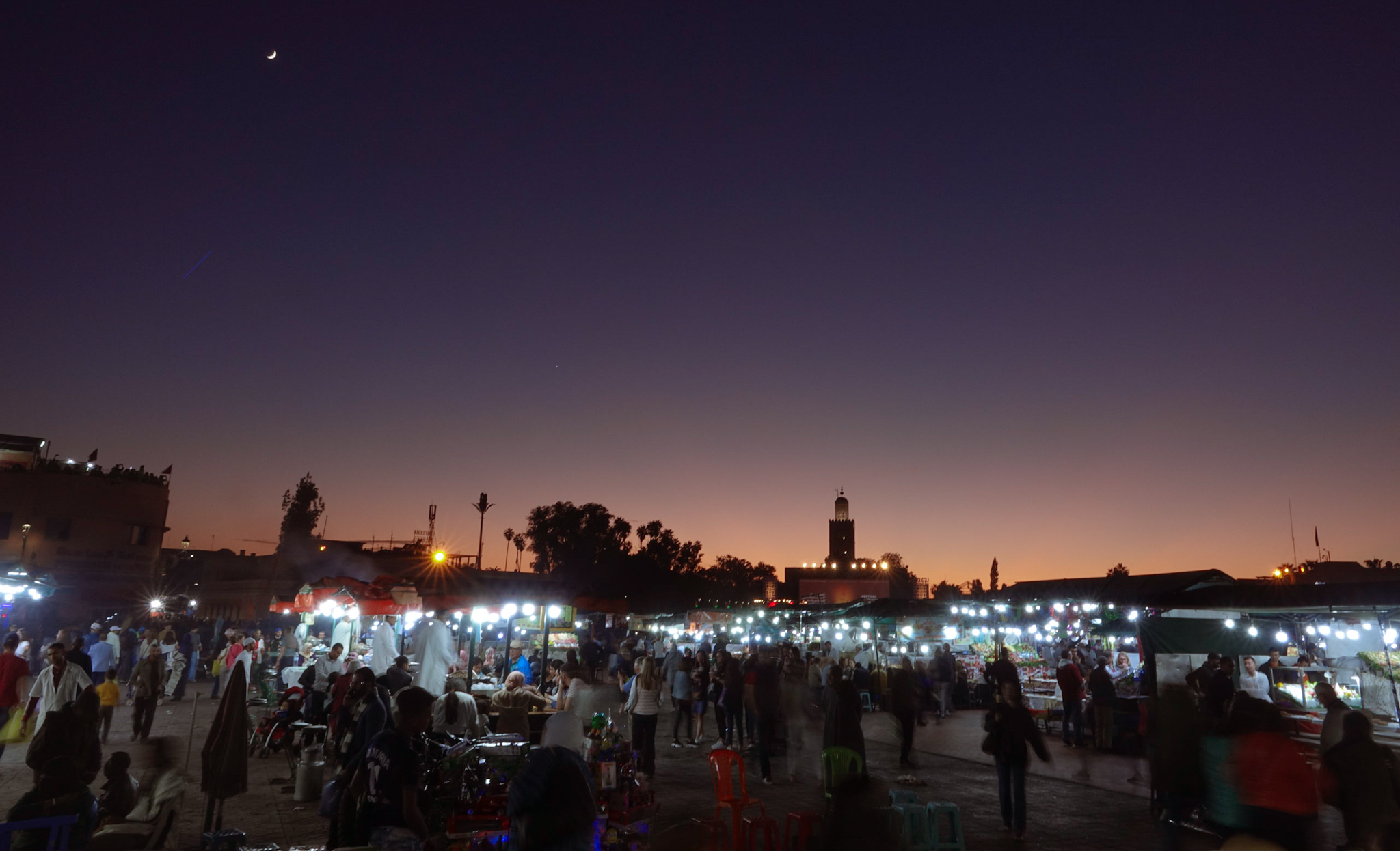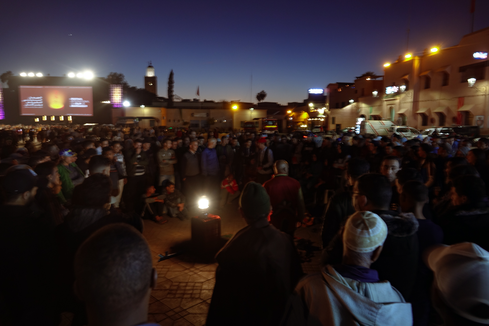 Landing in Marrakesh, we unfortunately fail to find the decently priced bus to the city center (it’s not signposted, and conveniently hidden behind the taxis), and can’t find any “petit taxi” using a meter, so we end up paying almost 20 euros for a taxi from the organized taxi stand – about three times as much as the bus would have cost. Apparently there are also 2 streets called “Derb Jdid” in Marrakesh, and Google Maps sends us to the wrong one, so we end up seeing more of Marrakesh’s medina (medieval inner city) than we planned. After finding the correct Derb Jdid, and dropping off our bags, we check out the central square of Marrakesh, Jemaa el Fna. It’s evening now, so it’s full of food stalls, with incredibly persistant hawkers trying to get us to eat at their stand. We have some snails followed by grilled fish; the herb-filled sardines are particularly tasty. Today is the first day of the Marrakesh Film Festival, and there is a big screen showing King Kong on the square. Thousands of people are watching it, which unfortunately leaves little place for the usual mayhem of musicians, theater, storytellers et cetera.