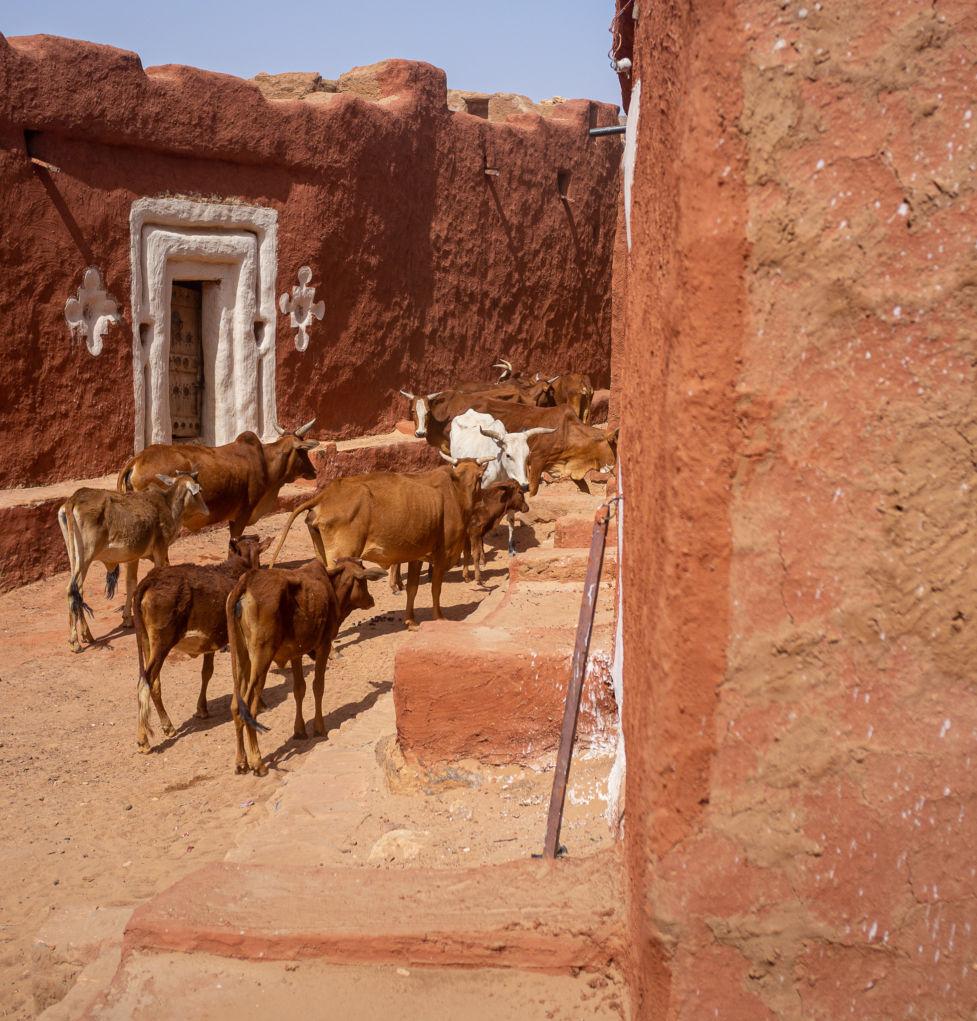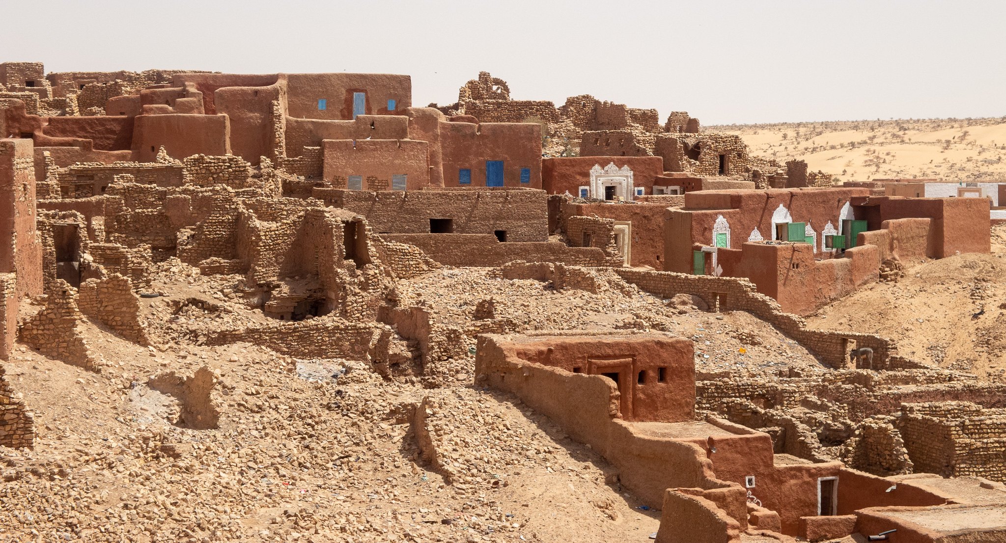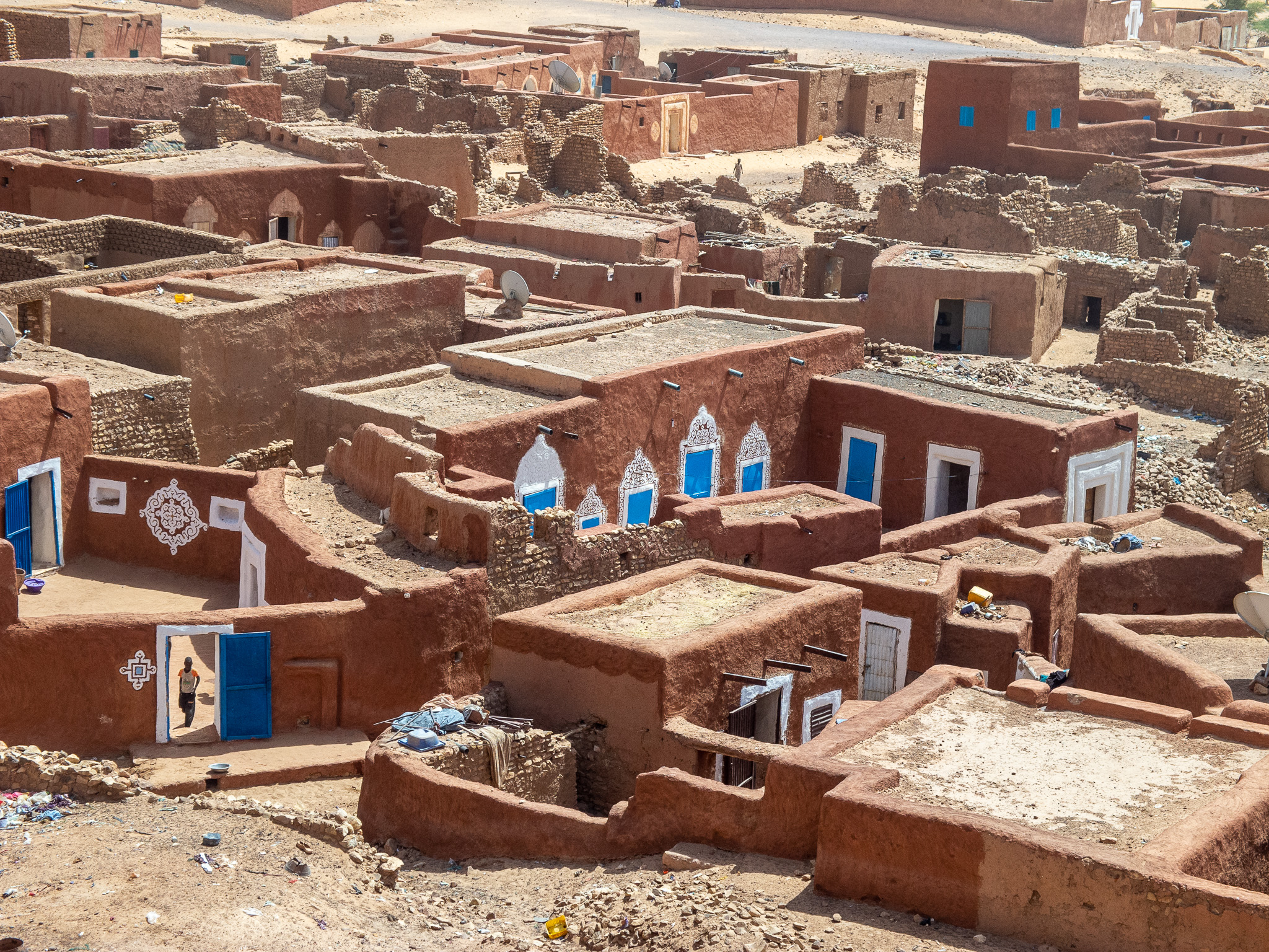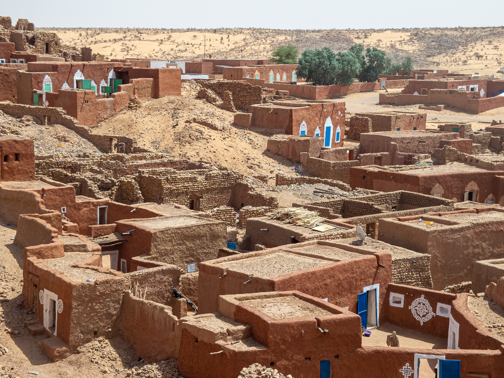 The following morning, my “assigned guide” is back, for a tour of the town. Given the steep prices, I can only afford a morning tour. At least I can see why Oualata’s old center became a Unesco World Heritage Site. As in Chinguetti and Ouadane in the Adrar region, the houses are built from stones, in the Berber style. Unlike those towns, though, they are then covered in mud plaster; this is probably an influence from the Soninke (a black culture from the Sahel and savannah, and founders of the Ghana empire). Mud is a construction material that’s typical of the edges of the desert; there’s just enough rainfall to make mud at least once a year, but not enough rain to wash away the resulting buildings. The orange, pink and yellow mud plaster in Oualata is often decorated with white geometric medallion patterns on the outside; the interior walls are often decorated in curly patterns. I’m not sure whether these patterns are of Berber, Arab, or Soninke heritage, but it gives the town an appearance unlike anything I’ve seen elsewhere in the Sahara or Sahel. Add in some cow herders walking their animals through town, lots of kids saying “bonjour monsieur!”, and smiling adults, and Oualata feels like a breath of fresh air after the tense atmosphere in Nema. If you’ve ever seen the fantastic movie Timbuktu (if you haven’t: find a way to see it, on the largest screen you can find), you’ve actually been looking at Oualata (Timbuktu was too dangerous at the time of filming).