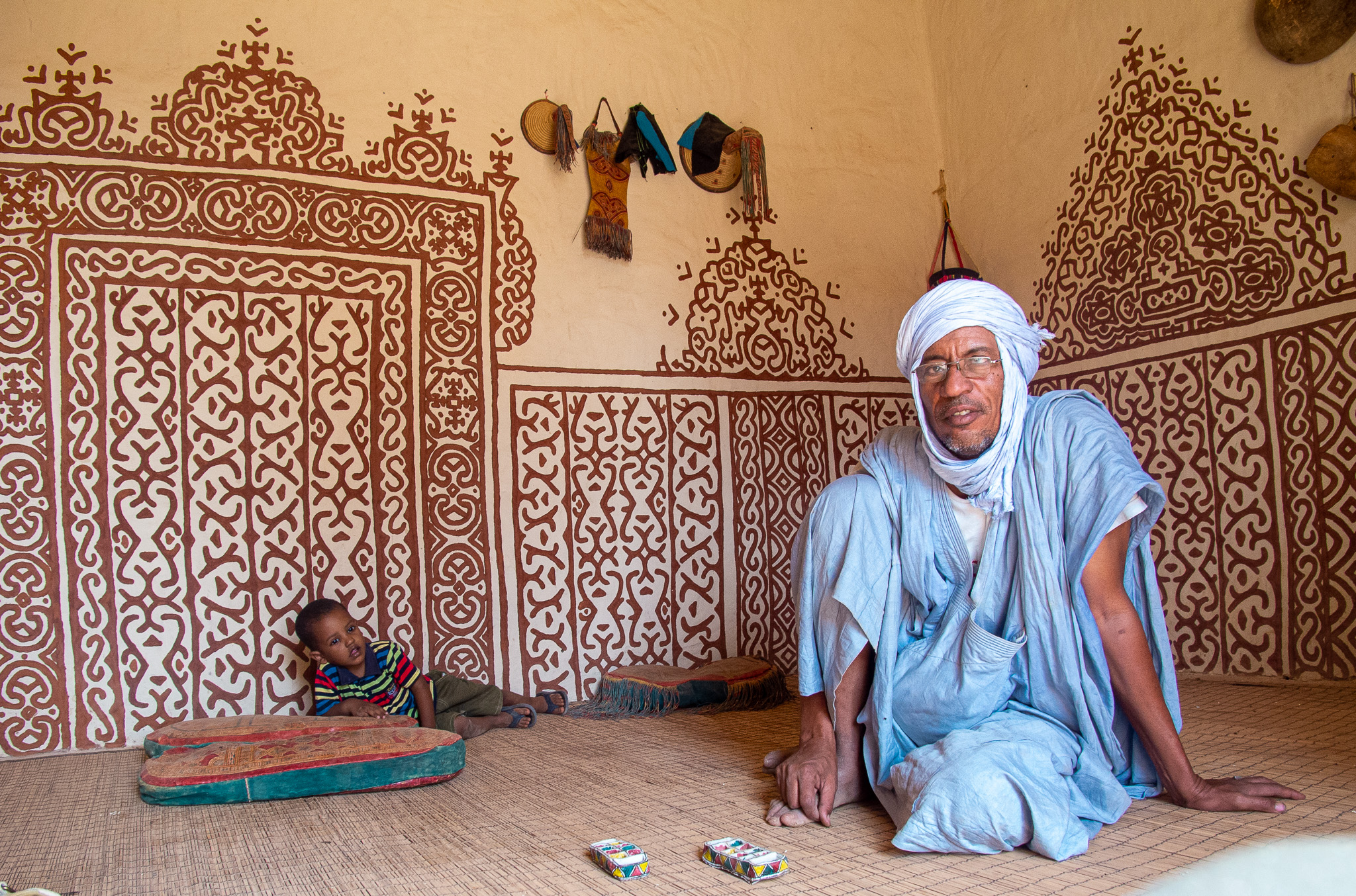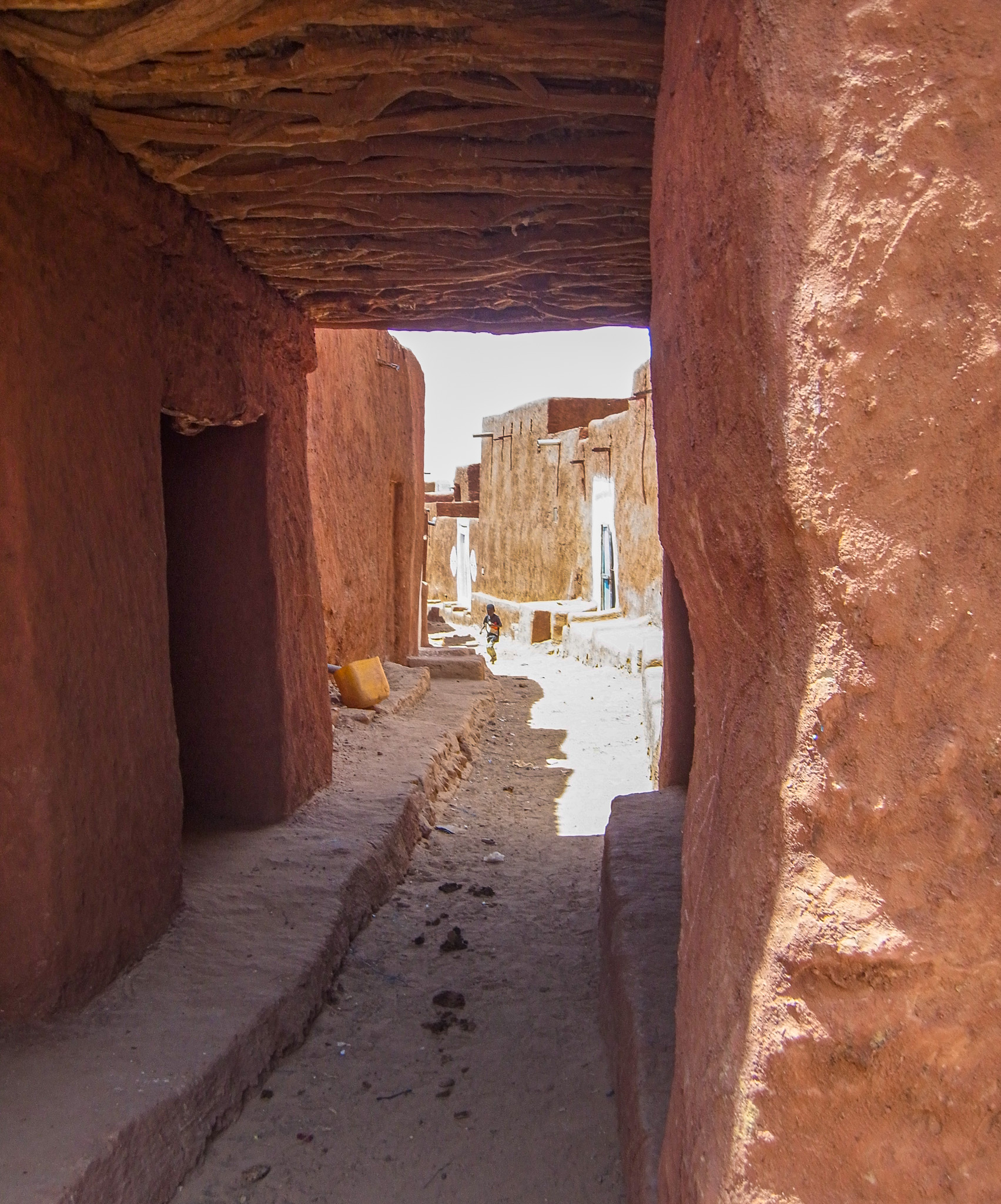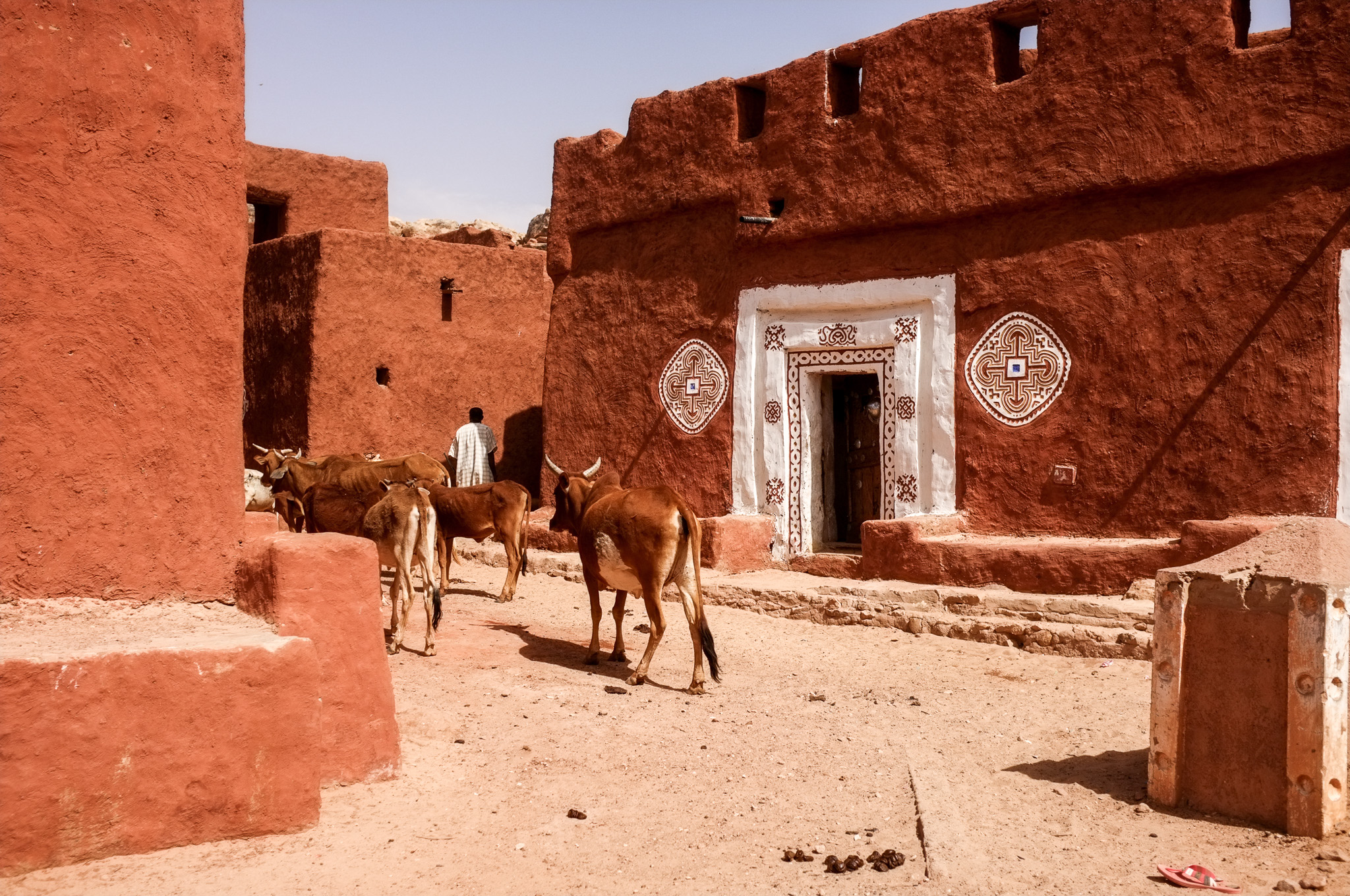The following morning, my “assigned guide” is back, for a tour of the town. Given the steep prices, I can only afford a morning tour. At least I can see why Oualata’s old center became a Unesco World Heritage Site. As in Chinguetti and Ouadane in the Adrar region, the houses are built from stones, in the Berber style. Unlike those towns, though, they are then covered in mud plaster; this is probably an influence from the Soninke (a black culture from the Sahel and savannah, and founders of the Ghana empire). Mud is a construction material that’s typical of the edges of the desert; there’s just enough rainfall to make mud at least once a year, but not enough rain to wash away the resulting buildings. The orange, pink and yellow mud plaster in Oualata is often decorated with white geometric medallion patterns on the outside; the interior walls are often decorated in curly patterns. I’m not sure whether these patterns are of Berber, Arab, or Soninke heritage, but it gives the town an appearance unlike anything I’ve seen elsewhere in the Sahara or Sahel. Add in some cow herders walking their animals through town, lots of kids saying “bonjour monsieur!”, and smiling adults, and Oualata feels like a breath of fresh air after the tense atmosphere in Nema. If you’ve ever seen the fantastic movie Timbuktu (if you haven’t: find a way to see it, on the largest screen you can find), you’ve actually been looking at Oualata (Timbuktu was too dangerous at the time of filming).