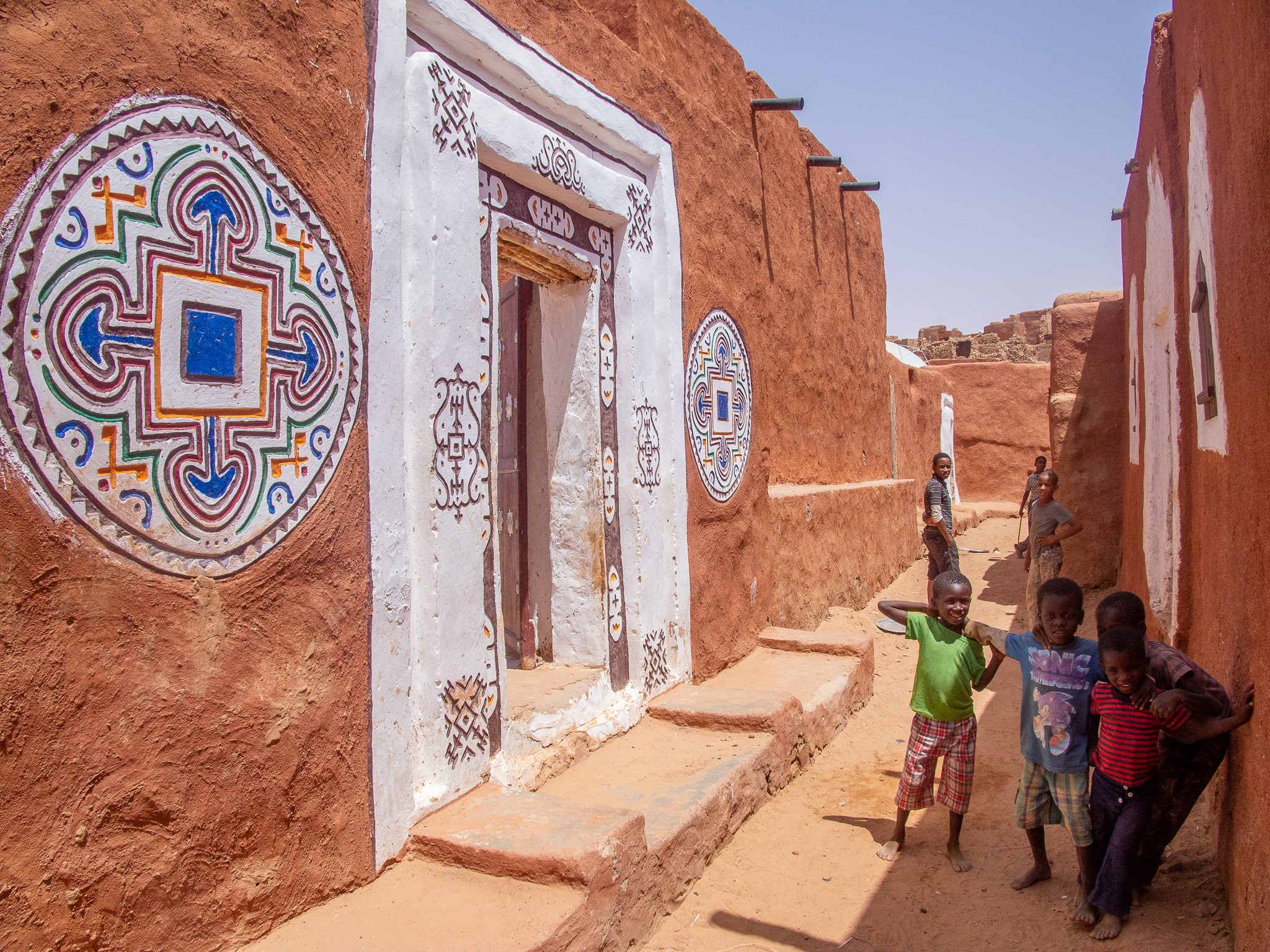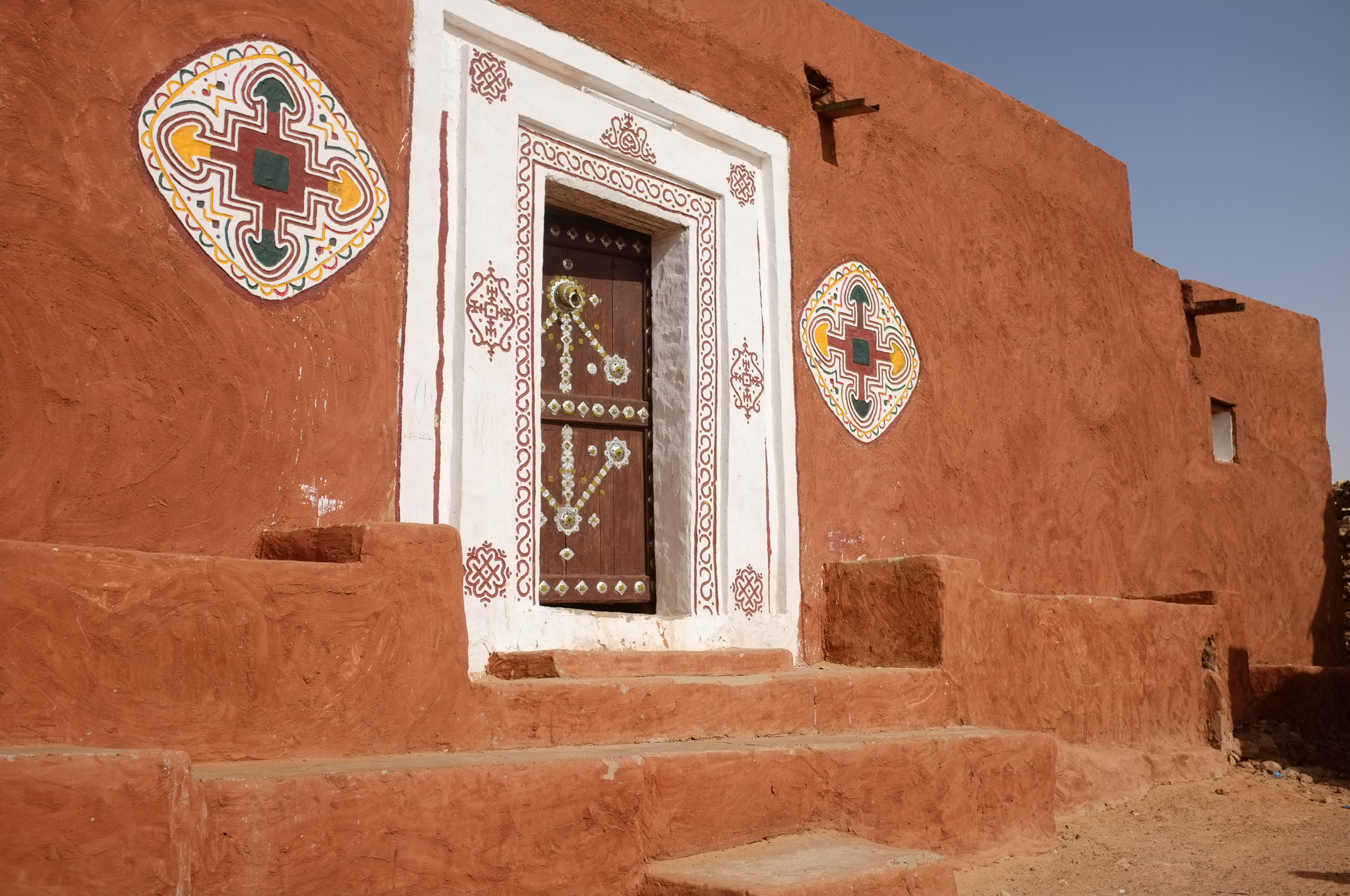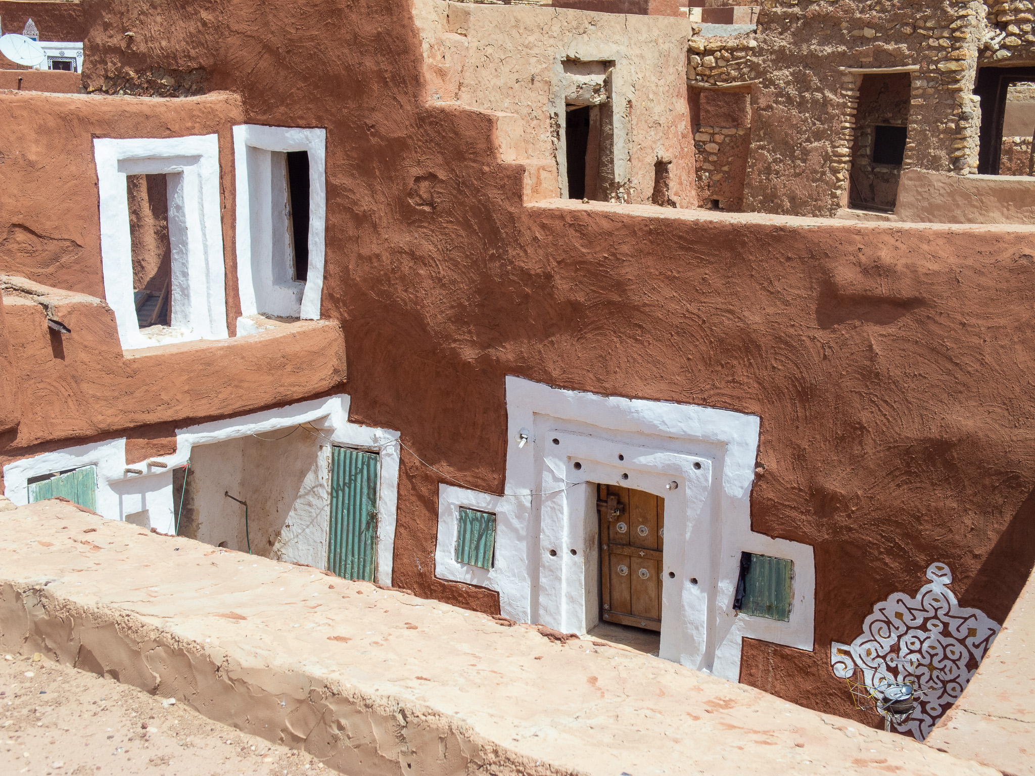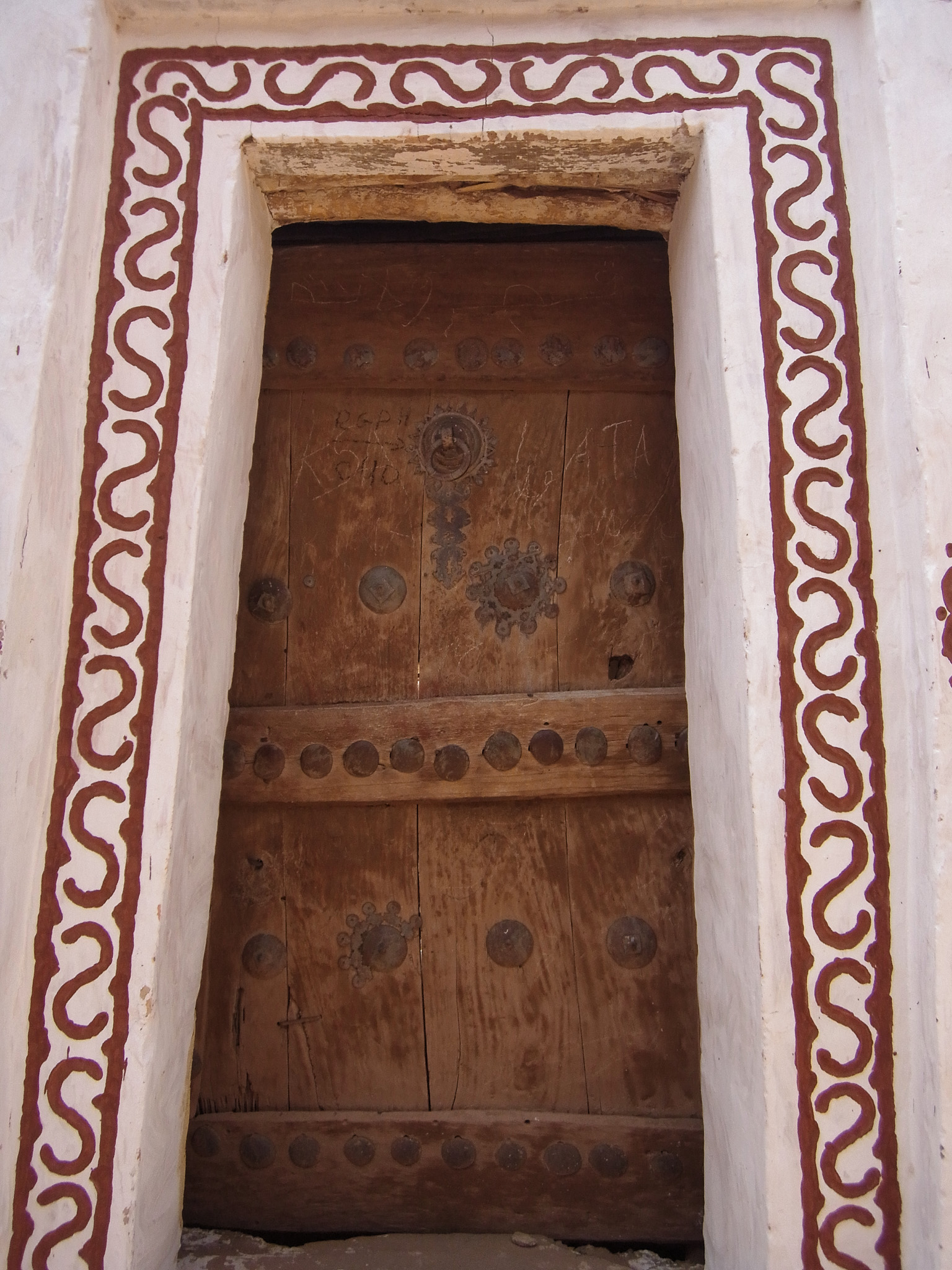 The following morning, my “assigned guide” is back, for a tour of the town. Given the steep prices, I can only afford a morning tour. At least I can see why Oualata’s old center became a Unesco World Heritage Site. As in Chinguetti and Ouadane in the Adrar region, the houses are built from stones, in the Berber style. Unlike those towns, though, they are then covered in mud plaster; this is probably an influence from the Soninke (a black culture from the Sahel and savannah, and founders of the Ghana empire). Mud is a construction material that’s typical of the edges of the desert; there’s just enough rainfall to make mud at least once a year, but not enough rain to wash away the resulting buildings. The orange, pink and yellow mud plaster in Oualata is often decorated with white geometric medallion patterns on the outside; the interior walls are often decorated in curly patterns. I’m not sure whether these patterns are of Berber, Arab, or Soninke heritage, but it gives the town an appearance unlike anything I’ve seen elsewhere in the Sahara or Sahel. Add in some cow herders walking their animals through town, lots of kids saying “bonjour monsieur!”, and smiling adults, and Oualata feels like a breath of fresh air after the tense atmosphere in Nema. If you’ve ever seen the fantastic movie Timbuktu (if you haven’t: find a way to see it, on the largest screen you can find), you’ve actually been looking at Oualata (Timbuktu was too dangerous at the time of filming).